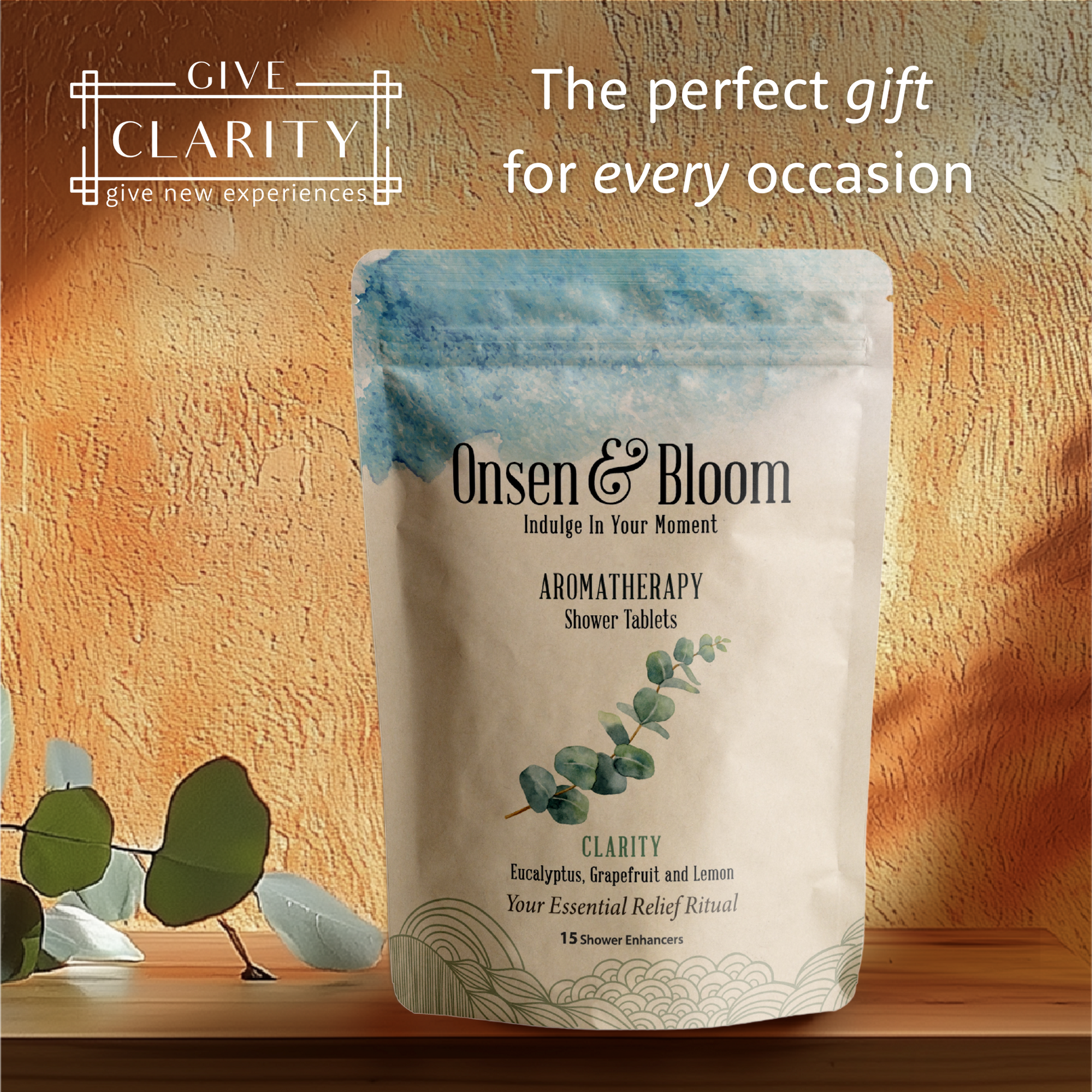 The Clarity pouch of 15 aromatherapy shower tablets convert your daily shower into your essential relief ritual. Each tablet has a unique blend of Eucalyptus, Lemon and Grapefruit essential oils that activate with water to create a unique shower experience. This aroma is perfect to clear your mind and sinuses as well as uplift your mood.
